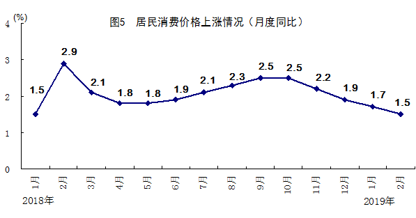 1-2月份,全国居民消费价格同比上涨1.6%,涨幅比上年12月份回落0.3个百分点。分类别看,食品烟酒价格同比上涨1.6%,衣着上涨1.8%,居住上涨2.1%,生活用品及服务上涨1.4%,交通和通信下降1.2%,教育文化和娱乐上涨2.6%,医疗保健上涨2.7%,其他用品和服务上涨2.1%。在食品烟酒价格中,粮食价格同比上涨0.5%,猪肉价格下降4.1%,鲜菜价格上涨2.6%。分月看,1、2月份全国居民消费价格同比分别上涨1.7%和1.5%,环比分别上涨0.5%和1.0%。