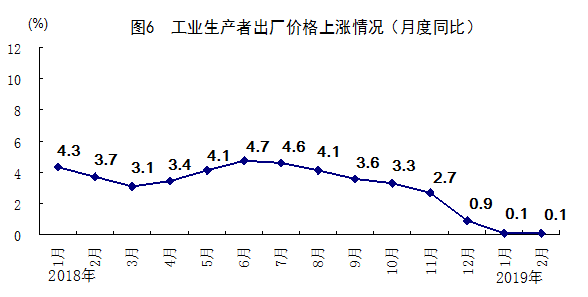 1-2月份,全国工业生产者出厂价格同比上涨0.1%,涨幅比上年12月份回落0.8个百分点。分月看,1、2月份全国工业生产者出厂价格同比均上涨0.1%,环比分别下降0.6%和0.1%。1-2月份,全国工业生产者购进价格同比上涨0.1%,比上年12月份回落1.5个百分点。