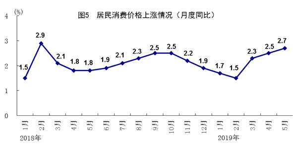 5月份,全国居民消费价格同比上涨2.7%,涨幅比上月扩大0.2个百分点,环比持平。分类别看,食品烟酒价格同比上涨5.8%,衣着上涨1.7%,居住上涨1.8%,生活用品及服务上涨1.0%,交通和通信下降0.9%,教育文化和娱乐上涨2.6%,医疗保健上涨2.5%,其他用品和服务上涨2.1%。扣除食品和能源价格后的核心CPI上涨1.6%,涨幅比上月回落0.1个百分点。1-5月份,全国居民消费价格同比上涨2.2%。