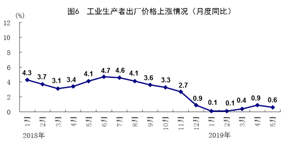 5月份,全国工业生产者出厂价格同比上涨0.6%,涨幅比上月回落0.3个百分点,环比上涨0.2%。全国工业生产者购进价格同比上涨0.2%,环比持平。1-5月份,全国工业生产者出厂价格和全国工业生产者购进价格同比分别上涨0.4%和0.2%。