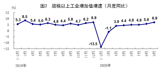 前三季度,全国规模以上工业增加值同比增长1.2%,上半年为下降1.3%。其中,三季度同比增长5.8%,比二季度加快1.4个百分点。9月份,规模以上工业增加值同比增长6.9%,增速比8月份加快1.3个百分点,连续6个月增长;环比增长1.18%。前三季度,分经济类型看,国有控股企业增加值同比增长0.9%;股份制企业增长1.5%,外商及港澳台商投资企业增长0.3%;私营企业增长2.1%。分三大门类看,采矿业增加值同比下降0.6%,降幅比上半年收窄0.5个百分点;制造业增长1.7%,电力、热力、燃气及水生产和供应业增长0.8%,上半年分别为下降1.4%、0.9%。前三季度,高技术制造业、装备制造业增加值同比分别增长5.9%、4.7%。从产品产量看,前三季度,载货汽车,挖掘、铲土运输机械,工业机器人,集成电路产量同比分别增长23.4%、20.2%、18.2%、14.7%。1-8月份,全国规模以上工业企业实现利润37167亿元,同比下降4.4%,降幅比1-7月份收窄3.7个百分点。9月份,中国制造业采购经理指数为51.5%,比8月份上升0.5个百分点,连续7个月位于临界点之上。