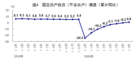 前三季度,全国固定资产投资(不含农户)436530亿元,同比增长0.8%,增速年内首次由负转正,上半年为下降3.1%。分领域看,基础设施投资增长0.2%,增速年内首次由负转正,上半年为下降2.7%;制造业投资下降6.5%,降幅比上半年收窄5.2个百分点;房地产开发投资增长5.6%,增速比上半年提高3.7个百分点。全国商品房销售面积117073万平方米,下降1.8%,降幅比上半年收窄6.6个百分点;商品房销售额115647亿元,增长3.7%,上半年为下降5.4%。分产业看,第一产业投资增长14.5%,增速比上半年提高10.7个百分点;第二产业投资下降3.4%,降幅比上半年收窄4.9个百分点;第三产业投资增长2.3%,上半年为下降1.0%。民间投资243998亿元,下降1.5%,降幅比上半年收窄5.8个百分点。高技术产业投资增长9.1%,增速比上半年提高2.8个百分点;其中高技术制造业和高技术服务业投资分别增长9.3%和8.7%。高技术制造业中,医药制造业、计算机及办公设备制造业投资分别增长21.2%、9.3%;高技术服务业中,电子商务服务业、信息服务业、科技成果转化服务业投资分别增长20.4%、16.9%、16.8%。社会领域投资增长9.2%,增速比上半年提高3.9个百分点;其中卫生、教育投资分别增长20.3%、12.7%,增速分别比上半年提高5.1、1.9个百分点。从环比看,9月份固定资产投资(不含农户)比上月增长3.37%。