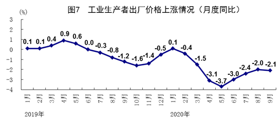 前三季度,全国工业生产者出厂价格同比下降2.0%;其中9月份同比下降2.1%,环比上涨0.1%。前三季度,全国工业生产者购进价格同比下降2.6%;其中9月份同比下降2.3%,环比上涨0.4%。