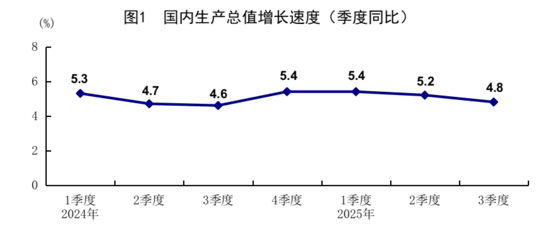 2024年各季度及2025年一季度、二季度、三季度GDP环比增速分别为1.3%、1.0%、1.5%、1.5%、1.2%、1.0%和1.1%。