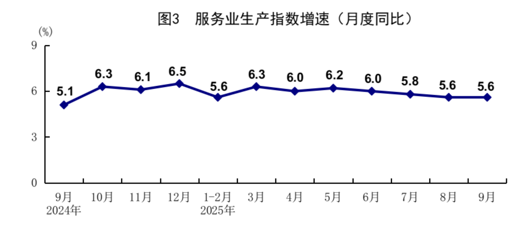前三季度,服务业增加值同比增长5.4%。其中,信息传输、软件和信息技术服务业,租赁和商务服务业,交通运输、仓储和邮政业,批发和零售业增加值分别增长11.2%、9.2%、5.8%、5.6%。9月份,全国服务业生产指数同比增长5.6%。其中,信息传输、软件和信息技术服务业,金融业,租赁和商务服务业,交通运输、仓储和邮政业生产指数分别增长12.8%、8.7%、7.8%、5.7%。1-8月份,规模以上服务业企业营业收入同比增长7.7%。9月份,服务业商务活动指数为50.1%,服务业业务活动预期指数为56.3%。其中,邮政、电信广播电视及卫星传输服务、货币金融服务等行业商务活动指数位于60.0%以上高位景气区间。