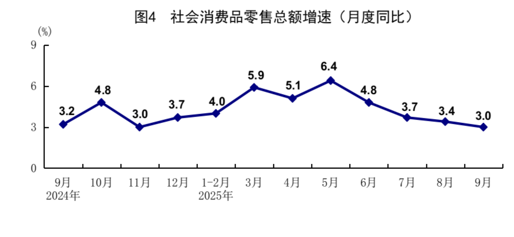 前三季度,社会消费品零售总额365877亿元,同比增长4.5%。按经营单位所在地分,城镇消费品零售额316838亿元,同比增长4.4%;乡村消费品零售额49039亿元,增长4.6%。按消费类型分,商品零售额324888亿元,增长4.6%;餐饮收入40989亿元,增长3.3%。基本生活类和部分升级类商品销售增势较好,限额以上单位粮油食品类、体育娱乐用品类、金银珠宝类商品零售额分别增长10.4%、19.6%、11.5%。消费品以旧换新政策持续显效,限额以上单位家用电器和音像器材类、家具类、通讯器材类、文化办公用品类商品零售额分别增长25.3%、21.3%、20.5%、19.9%。全国网上零售额112830亿元,同比增长9.8%。其中,实物商品网上零售额91528亿元,增长6.5%,占社会消费品零售总额的比重为25.0%。9月份,社会消费品零售总额同比增长3.0%,环比下降0.18%。前三季度,服务零售额同比增长5.2%。其中,文体休闲服务类、通讯信息服务类、旅游咨询租赁服务类、交通出行服务类零售额较快增长。