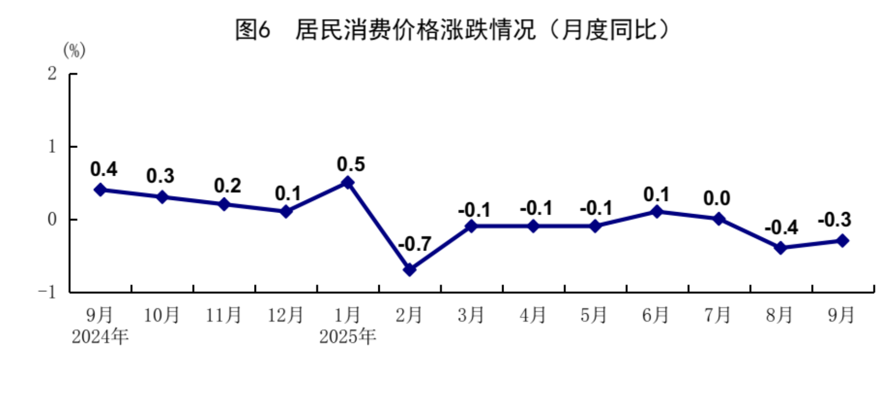 前三季度,全国居民消费价格(CPI)同比下降0.1%。分类别看,食品烟酒价格下降0.8%,衣着价格上涨1.5%,居住价格上涨0.1%,生活用品及服务价格上涨0.6%,交通通信价格下降2.8%,教育文化娱乐价格上涨0.8%,医疗保健价格上涨0.5%,其他用品及服务价格上涨7.4%。在食品烟酒价格中,鲜菜价格下降7.9%,猪肉价格下降2.9%,粮食价格下降1.2%,鲜果价格上涨1.2%。9月份,全国居民消费价格同比下降0.3%,环比上涨0.1%。前三季度,扣除食品和能源价格后的核心CPI同比上涨0.6%,涨幅比上半年扩大0.2个百分点。其中,9月份核心CPI同比上涨1.0%,比上月扩大0.1个百分点。