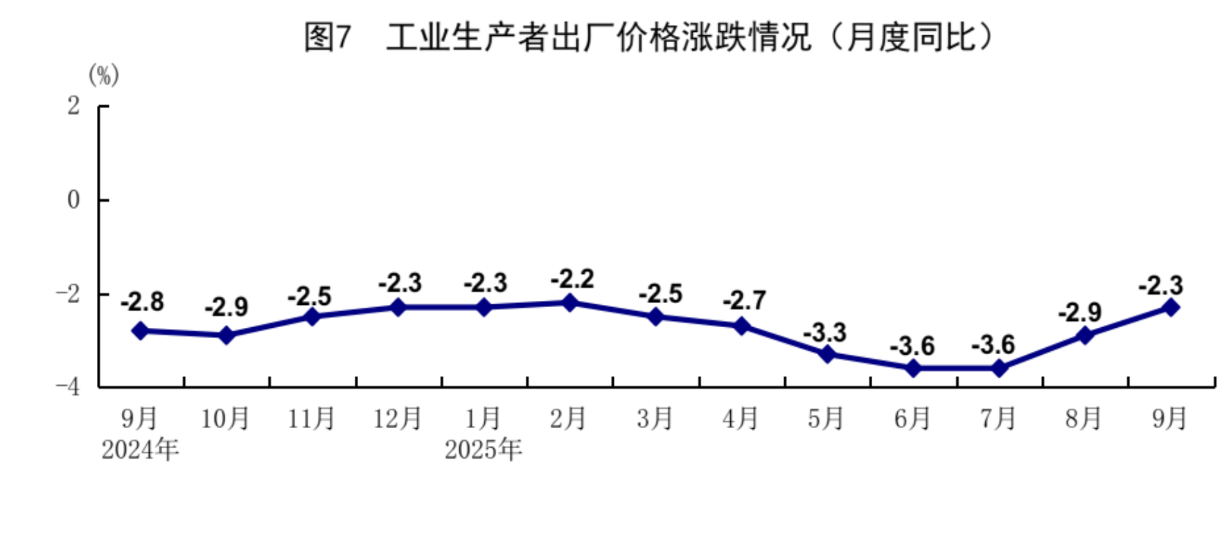 前三季度,全国工业生产者出厂价格同比下降2.8%。其中,9月份同比下降2.3%,降幅比上月收窄0.6个百分点,环比持平。前三季度,工业生产者购进价格同比下降3.2%。其中,9月份同比下降3.1%,降幅比上月收窄0.9个百分点,环比上涨0.1%。
