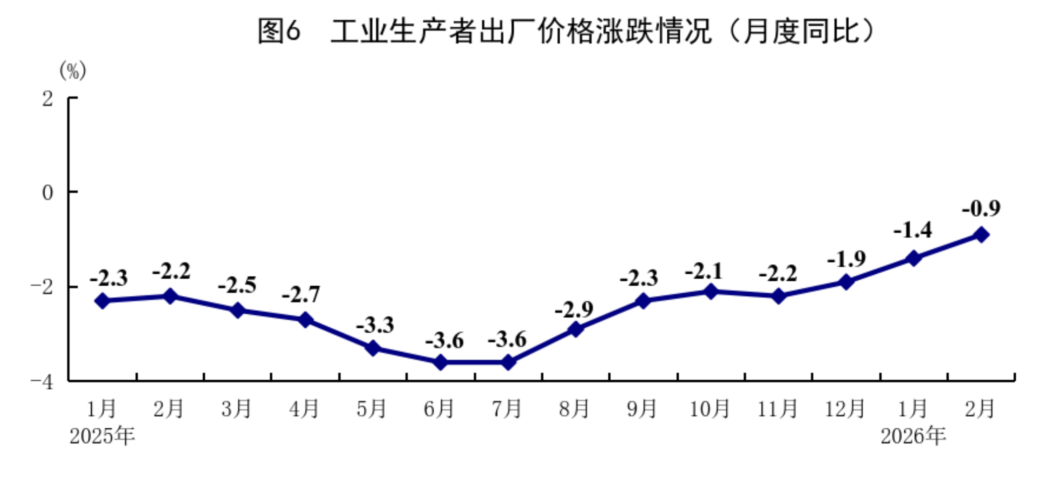 1—2月份,全国工业生产者出厂价格同比下降1.2%。分月看,1月份同比下降1.4%,环比上涨0.4%;2月份同比下降0.9%,环比上涨0.4%。1—2月份,全国工业生产者购进价格同比下降1.1%。