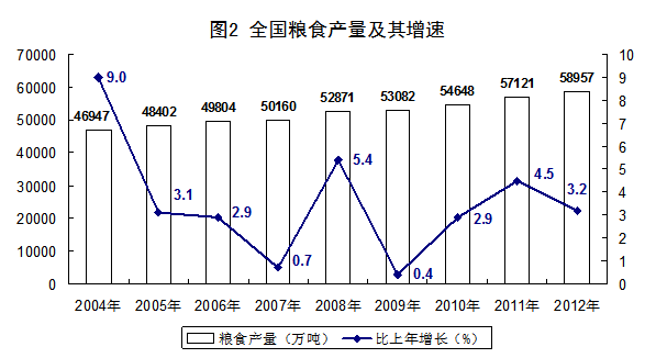 全年全国粮食总产量达到58957万吨,比上年增加1836万吨,增长3.2%,连续九年增产。其中,夏粮产量12995万吨,比上年增长2.8%;早稻产量3329万吨,增长1.6%;秋粮产量42633万吨,增长3.5%。全年棉花产量684万吨,比上年增长3.8%;油料产量3476万吨,增长5.1%;糖料产量13493万吨,增长7.8%。全年猪牛羊禽肉产量8221万吨,比上年增长5.4%,其中猪肉产量5335万吨,增长5.6%。生猪存栏47492万头,比上年增长1.6%;生猪出栏69628万头,比上年增长5.2%。全年禽蛋产量2861万吨,比上年增长1.8%;牛奶3744万吨,增长2.3%。