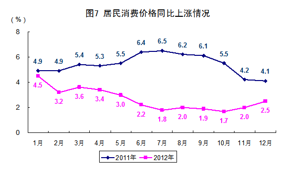 全年居民消费价格比上年上涨2.6%,涨幅比上年回落2.8个百分点。其中,城市上涨2.7%,农村上涨2.5%。分类别看,食品价格比上年上涨4.8%,烟酒及用品上涨2.9%,衣着上涨3.1%,家庭设备用品及维修服务上涨1.9%,医疗保健和个人用品上涨2.0%,交通和通信下降0.1%,娱乐教育文化用品及服务上涨0.5%,居住上涨2.1%。在食品价格中,粮食价格上涨4.0%,油脂价格上涨5.1%,肉禽及其制品价格上涨2.1%,鲜菜价格上涨15.9%,鲜果价格下降1.2%。12月份,居民消费价格同比上涨2.5%,环比上涨0.8%。全年工业生产者出厂价格比上年下降1.7%;12月份同比下降1.9%,环比下降0.1%。全年工业生产者购进价格比上年下降1.8%;12月份同比下降2.4%,环比下降0.1%。