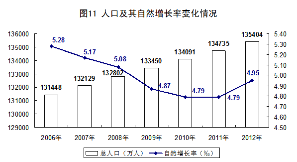 2012年末,中国大陆总人口(包括31个省、自治区、直辖市和中国人民解放军现役军人,不包括香港、澳门特别行政区和台湾省以及海外华侨人数)135404万人,比上年末增加669万人。出生人口1635万人,人口出生率为12.10‰,比上年提高0.17个千分点;死亡人口966万人,人口死亡率为7.15‰,比上年提高0.01个千分点;人口自然增长率为4.95‰,比上年提高0.16个千分点。从性别结构看,男性人口69395万人,女性人口66009万人;总人口性别比为105.13(以女性为100,男性对女性的比例),比上年末下降0.05;出生人口性别比为117.70,比上年末下降0.08。从年龄构成看,60岁及以上人口19390万人,占总人口的14.3%,比上年末提高0.59个百分点;65岁及以上人口12714万人,占总人口的9.4%,比上年末提高0.27个百分点;15-59岁劳动年龄人口93727万人,比上年减少345万人,占总人口的比重为69.2%,比上年末下降0.60个百分点。从城乡结构看,城镇人口71182万人,比上年末增加2103万人;乡村人口64222万人,减少1434万人;城镇人口占总人口比重达到52.57%,比上年末提高1.30个百分点。全国居住地和户口登记地不在同一个乡镇街道且离开户口登记地半年以上的人口(即人户分离人口)2.79亿人,比上年末增加789万人;其中流动人口为2.36亿人,比上年末增加669万人。年末全国就业人员76704万人,比上年末增加284万人;其中城镇就业人员37102万人,比上年末增加1188万人。