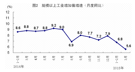 2014年各季度及2015年一季度GDP环比增速分别为1.6%、2.0%、1.9%、1.5%和1.3%。
