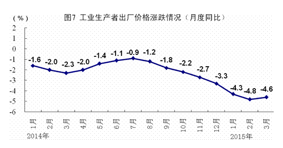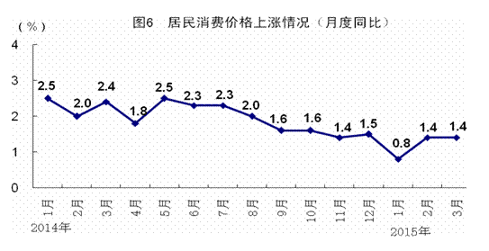 一季度,居民消费价格同比上涨1.2%。其中,城市上涨1.2%,农村上涨1.0%。分类别看,食品价格同比上涨1.9%,烟酒及用品下降0.5%,衣着上涨2.9%,家庭设备用品及维修服务上涨1.2%,医疗保健和个人用品上涨1.7%,交通和通信下降1.8%,娱乐教育文化用品及服务上涨1.2%,居住上涨0.7%。在食品价格中,粮食价格上涨2.8%,油脂价格下降5.1%,猪肉价格下降1.7%,鲜菜价格上涨1.4%。3月份,居民消费价格同比上涨1.4%,环比下降0.5%。一季度,工业生产者出厂价格同比下降4.6%,3月份同比下降4.6%,环比下降0.1%。一季度,工业生产者购进价格同比下降5.6%,3月份同比下降5.7%,环比下降0.3%。