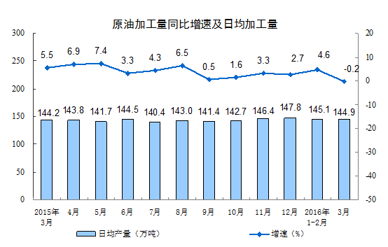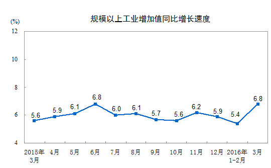 2016年3月份,规模以上工业增加值同比实际增长6.8%(以下增加值增速均为扣除价格因素的实际增长率),比1-2月份加快1.4个百分点。从环比看,3月份,规模以上工业增加值比上月增长0.64%。一季度,规模以上工业增加值同比增长5.8%。