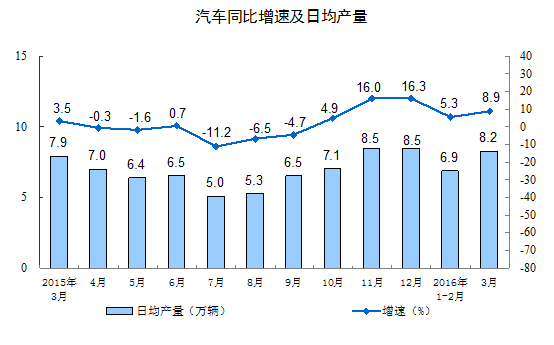 分行业看,3月份,41个大类行业中有38个行业增加值保持同比增长。其中,农副食品加工业增长4.7%,纺织业增长7.3%,化学原料和化学制品制造业增长8.9%,非金属矿物制品业增长9.8%,黑色金属冶炼和压延加工业增长3.3%,有色金属冶炼和压延加工业增长8.9%,通用设备制造业增长6.0%,专用设备制造业增长4.1%,汽车制造业增长11.4%,铁路、船舶、航空航天和其他运输设备制造业增长3.3%,电气机械和器材制造业增长9.4%,计算机、通信和其他电子设备制造业增长8.4%,电力、热力生产和供应业增长4.1%。