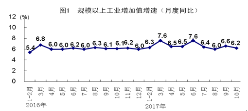 10月份,全国规模以上工业增加值同比实际增长6.2%,增速比上月回落0.4个百分点,比上年同月加快0.1个百分点。分经济类型看,国有控股企业增加值同比增长6.6%,集体企业增长3.6%,股份制企业增长6.1%,外商及港澳台商投资企业增长6.5%。分三大门类看,采矿业增加值同比下降1.3%,制造业增长6.7%,电力、热力、燃气及水生产和供应业增长9.2%。规模以上工业企业产销率达到97.8%。1-10月份,全国规模以上工业增加值同比增长6.7%,增速与1-9月份持平,比上年同期加快0.7个百分点。