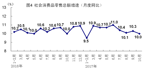 10月份,社会消费品零售总额34241亿元,同比增长10.0%,增速比上月回落0.3个百分点,与上年同月持平。按经营单位所在地分,城镇消费品零售额29537亿元,同比增长9.8%;乡村消费品零售额4704亿元,增长11.3%。按消费类型分,餐饮收入3852亿元,增长10.3%;商品零售30389亿元,增长10.0%。消费升级类商品快速增长,10月份,限额以上单位体育娱乐用品类、化妆品类商品零售额同比分别增长19.6%和16.1%。1-10月份,社会消费品零售总额同比增长10.3%,增速与上年同期持平。