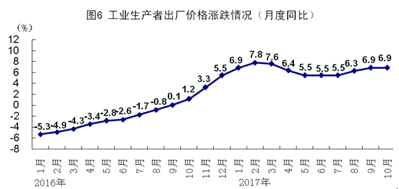 10月份,全国工业生产者出厂价格同比上涨6.9%,涨幅与上月持平,环比上涨0.7%。1-10月份,全国工业生产者出厂价格同比上涨6.5%。10月份,全国工业生产者购进价格同比上涨8.4%,环比上涨0.9%。1-10月份,全国工业生产者购进价格同比上涨8.4%。