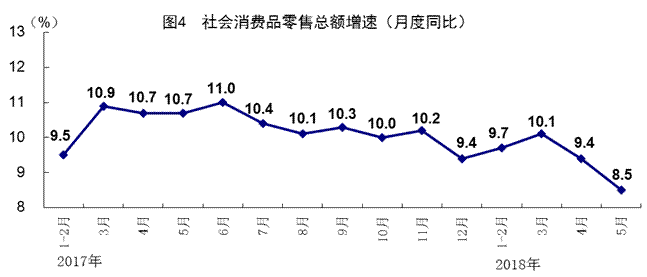 5月份,社会消费品零售总额30359亿元,同比增长8.5%,增速比上月回落0.9个百分点。按经营单位所在地分,城镇消费品零售额26092亿元,同比增长8.3%;乡村消费品零售额4267亿元,增长9.6%。按消费类型分,餐饮收入3321亿元,增长8.8%;商品零售27038亿元,增长8.4%。消费升级类商品增长较快,限额以上单位通讯器材类、化妆品类、石油及制品类商品零售同比分别增长12.2%、10.3%和14.0%。1-5月份,社会消费品零售总额同比增长9.5%,增速比1-4月份回落0.2个百分点。