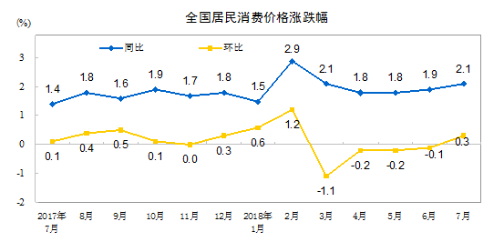 2018年7月份,全国居民消费价格同比上涨2.1%。其中,城市上涨2.1%,农村上涨2.0%;食品价格上涨0.5%,非食品价格上涨2.4%;消费品价格上涨1.8%,服务价格上涨2.5%。1-7月平均,全国居民消费价格比去年同期上涨2.0%。