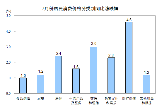其他七大类价格同比均上涨。其中,医疗保健、交通和通信、居住价格分别上涨4.6%、3.0%和2.4%,教育文化和娱乐、生活用品及服务价格分别上涨2.3%和1.6%,衣着、其他用品和服务价格均上涨1.2%。
