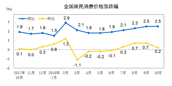 2018年10月份,全国居民消费价格同比上涨2.5%。其中,城市上涨2.5%,农村上涨2.6%;食品价格上涨3.3%,非食品价格上涨2.4%;消费品价格上涨2.8%,服务价格上涨2.1%。1-10月平均,全国居民消费价格比去年同期上涨2.1%。