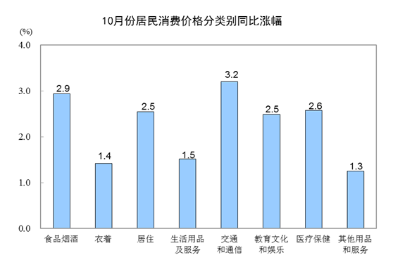 其他七大类价格同比均上涨。其中,交通和通信、医疗保健价格分别上涨3.2%和2.6%,居住、教育文化和娱乐价格均上涨2.5%,生活用品及服务、衣着、其他用品和服务价格分别上涨1.5%、1.4%和1.3%。