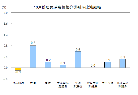 10月份,全国居民消费价格环比上涨0.2%。其中,城市上涨0.2%,农村上涨0.2%;食品价格下降0.3%,非食品价格上涨0.3%;消费品价格上涨0.3%,服务价格持平。
