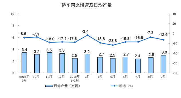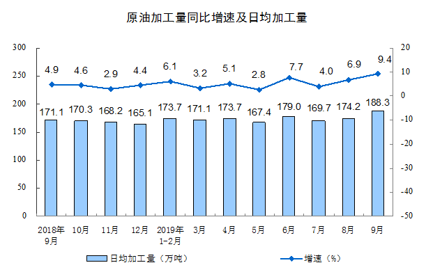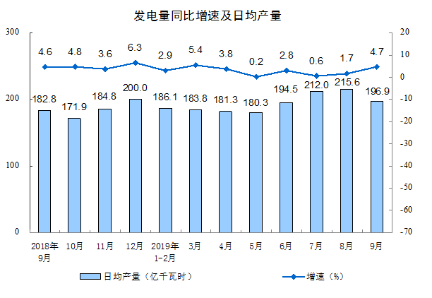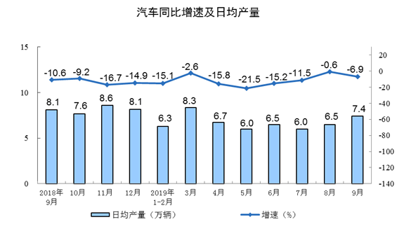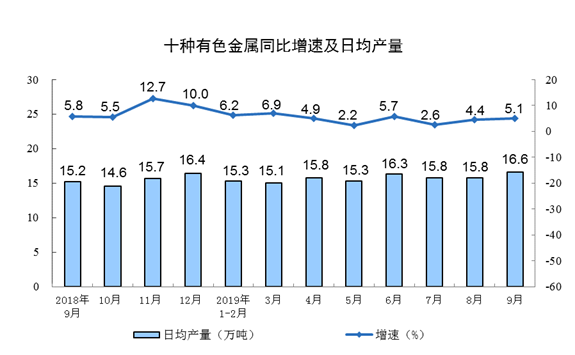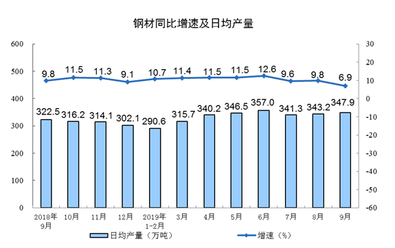 分行业看,9月份,41个大类行业中有35个行业增加值保持同比增长。农副食品加工业下降1.2%,纺织业增长0.6%,化学原料和化学制品制造业增长3.3%,非金属矿物制品业增长7.0%,黑色金属冶炼和压延加工业增长9.5%,有色金属冶炼和压延加工业增长7.7%,通用设备制造业增长3.5%,专用设备制造业增长7.0%,汽车制造业增长0.5%,铁路、船舶、航空航天和其他运输设备制造业增长4.7%,电气机械和器材制造业增长12.1%,计算机、通信和其他电子设备制造业增长11.4%,电力、热力生产和供应业增长5.4%。