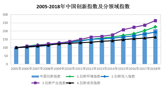 据国家统计局社科文司《中国创新指数研究》课题组测算[1],2018年中国创新指数首次突破200,达到212.0(以2005年为100),比上年增长8.6%,较2005年实现翻番。分领域看,创新环境指数、创新投入指数、创新产出指数和创新成效指数比上年均呈现不同程度的增长。测算结果表明,2018年,我国创新环境持续优化,创新投入不断加大,创新成效逐步显现,科技实力和创新能力再上新台阶。