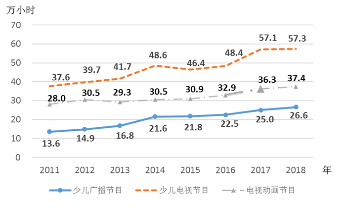 图7 2011—2018年少儿广播节目、少儿电视节目、电视动画节目播出时间情况