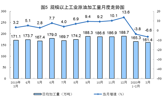 原油生产略有下降,加工量降幅扩大。3月份,生产原油1656万吨,同比下降0.1%,日均产量53.4万吨;加工原油5004万吨,同比下降6.6%,日均加工161.4万吨。一季度,生产原油4857万吨,同比增长2.4%;加工原油14928万吨,同比下降4.6%。