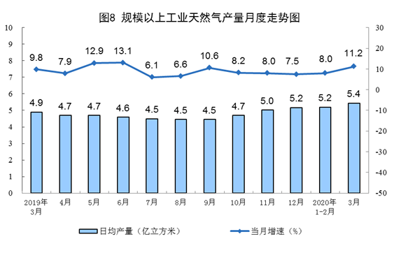 天然气生产快速增长。3月份,生产天然气169亿立方米,同比增长11.2%,日均产量5.4亿立方米。一季度,生产天然气483亿立方米,同比增长9.1%。