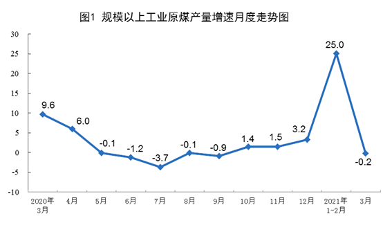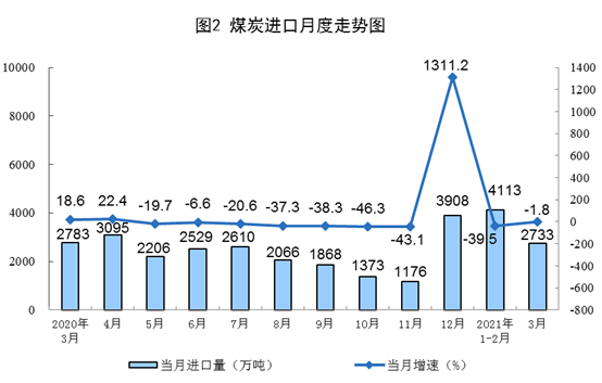 原煤生产小幅下降。3月份,生产原煤3.4亿吨,同比下降0.2%,比2019年3月份增长9.4%,两年平均增长4.6%,日均产量1099万吨;进口煤炭2733万吨,同比下降1.8%。