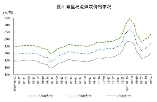 港口煤炭综合交易价格有所上涨。4月2日,秦皇岛港5500、5000和4500大卡煤炭价格分别为每吨634元、567元和502元,比3月5日分别上涨54元、49元和39元。