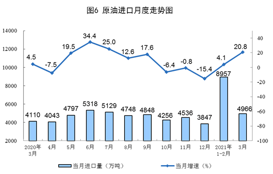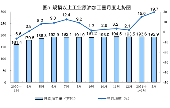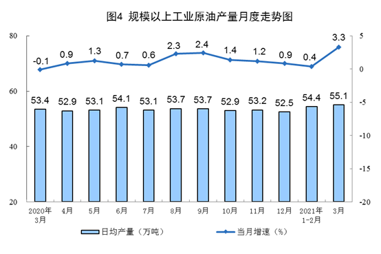 原油生产加快,加工量较快增长。3月份,生产原油1709万吨,同比增长3.3%,比2019年3月份增长3.3%,两年平均增长1.6%,日均产量55.1万吨。加工原油5979万吨,同比增长19.7%,比2019年3月份增长11.8%,两年平均增长5.8%,日均加工192.9万吨。