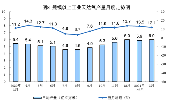 天然气生产保持较快增长。3月份,生产天然气185亿立方米,同比增长12.1%,比2019年3月份增长24.7%,两年平均增长11.7%,日均产量6.0亿立方米。