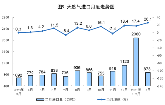 天然气进口大幅增长。3月份,进口天然气873万吨,同比增长26.1%。一季度,进口天然气2939万吨,同比增长19.6%。