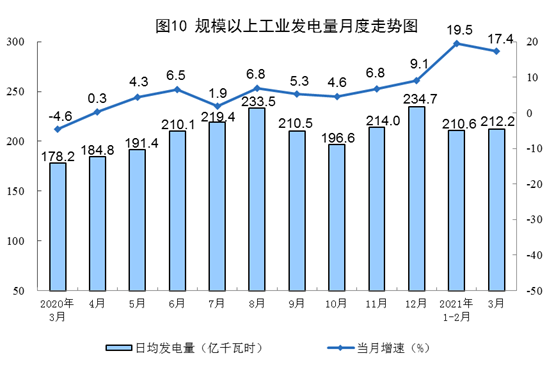 电力生产增长较快。3月份,发电6579亿千瓦时,同比增长17.4%,比2019年3月份增长12.0%,两年平均增长5.8%,日均发电212.2亿千瓦时。一季度,发电19051亿千瓦时,同比增长19.0%,比2019年一季度增长10.8%,两年平均增长5.3%。