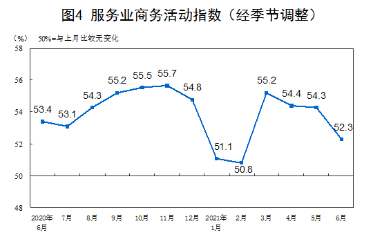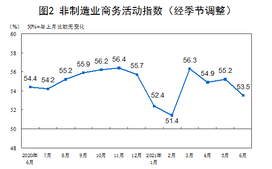 6月份,非制造业商务活动指数为53.5%,较上月回落1.7个百分点,非制造业扩张力度有所减弱。