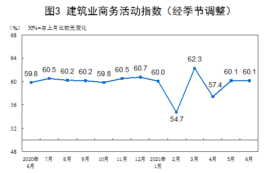 分行业看,建筑业商务活动指数为60.1%,与上月持平。服务业商务活动指数为52.3%,低于上月2.0个百分点。从行业情况看,邮政、电信广播电视卫星传输服务、货币金融服务、资本市场服务、保险等行业商务活动指数位于59.0%以上较高景气区间;航空运输、住宿、餐饮、房地产、租赁及商务服务等行业商务活动指数位于临界点以下。