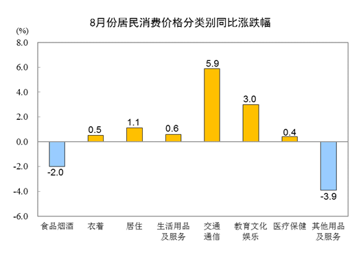其他七大类价格同比六涨一降。其中,交通通信、教育文化娱乐、居住价格分别上涨5.9%、3.0%和1.1%,生活用品及服务、衣着、医疗保健价格分别上涨0.6%、0.5%和0.4%;其他用品及服务价格下降3.9%。