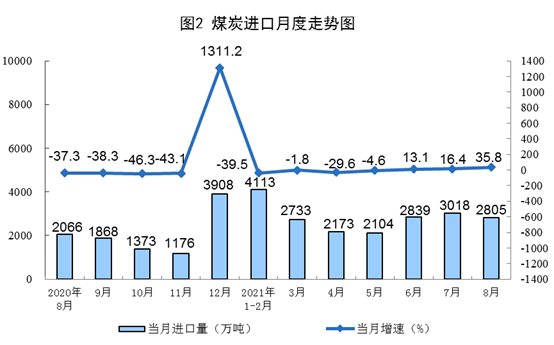 原煤生产由降转升。8月份,生产原煤3.4亿吨,同比增速由上月下降3.3%转为增长0.8%,比2019年同期增长0.7%,两年平均增长0.3%,日均产量1081万吨。进口煤炭2805万吨,同比增长35.8%