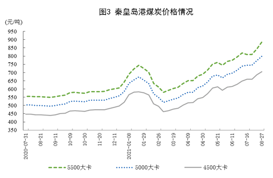 港口煤炭综合交易价格上涨。827日,秦皇岛港5500大卡、5000大卡、4500大卡动力煤综合交易价格分别为每吨885元、798元和706元,比730日分别上涨40元、25元和20元。