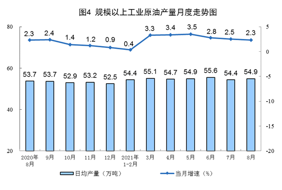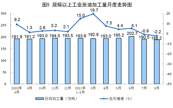 原油生产平稳,加工量降幅有所扩大。8月份,生产原油1703万吨,同比增长2.3%,增速比上月回落0.2个百分点,比2019年同期增长4.7%,两年平均增长2.3%,日均产量54.9万吨;加工原油5835万吨,同比下降2.2%,降幅比上月扩大1.3个百分点,比2019年同期增长6.8%,两年平均增长3.3%,日均加工188.2万吨。