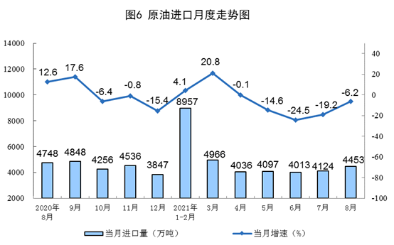 18月份,生产原油13322万吨,同比增长2.4%,比2019年同期增长4.0%,两年平均增长2.0%;加工原油47079万吨,同比增长7.4%,比2019年同期增长10.8%,两年平均增长5.3%