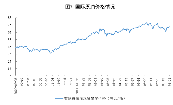 原油进口降幅继续收窄,国际原油价格略有回落。8月份,进口原油4453万吨,同比下降6.2%,降幅比上月收窄13.0个百分点;18月份,进口原油34636万吨,同比下降5.7%8月份,国际油价仍在65美元/桶—75美元/桶区间震荡,831日,布伦特原油现货离岸价格为73.45美元/桶,比730日的77.72美元/桶下降5.5%
