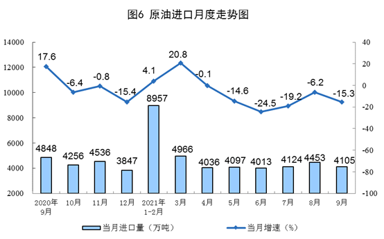 1—9月份,生产原油14984万吨,同比增长2.5%,比2019年同期增长4.3%,两年平均增长2.1%;加工原油52687万吨,同比增长6.2%,比2019年同期增长9.4%,两年平均增长4.6%。