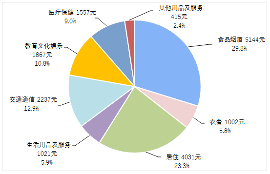 前三季度,全国居民人均食品烟酒消费支出5144元,增长13.2%,占人均消费支出的比重为29.8%;人均衣着消费支出1002元,增长18.2%,占人均消费支出的比重为5.8%;人均居住消费支出4031元,增长7.9%,占人均消费支出的比重为23.3%;人均生活用品及服务消费支出1021元,增长14.0%,占人均消费支出的比重为5.9%;人均交通通信消费支出2237元,增长14.4%,占人均消费支出的比重为12.9%;人均教育文化娱乐消费支出1867元,增长46.3%,占人均消费支出的比重为10.8%;人均医疗保健消费支出1557元,增长16.4%,占人均消费支出的比重为9.0%;人均其他用品及服务消费支出415元,增长26.3%,占人均消费支出的比重为2.4%。